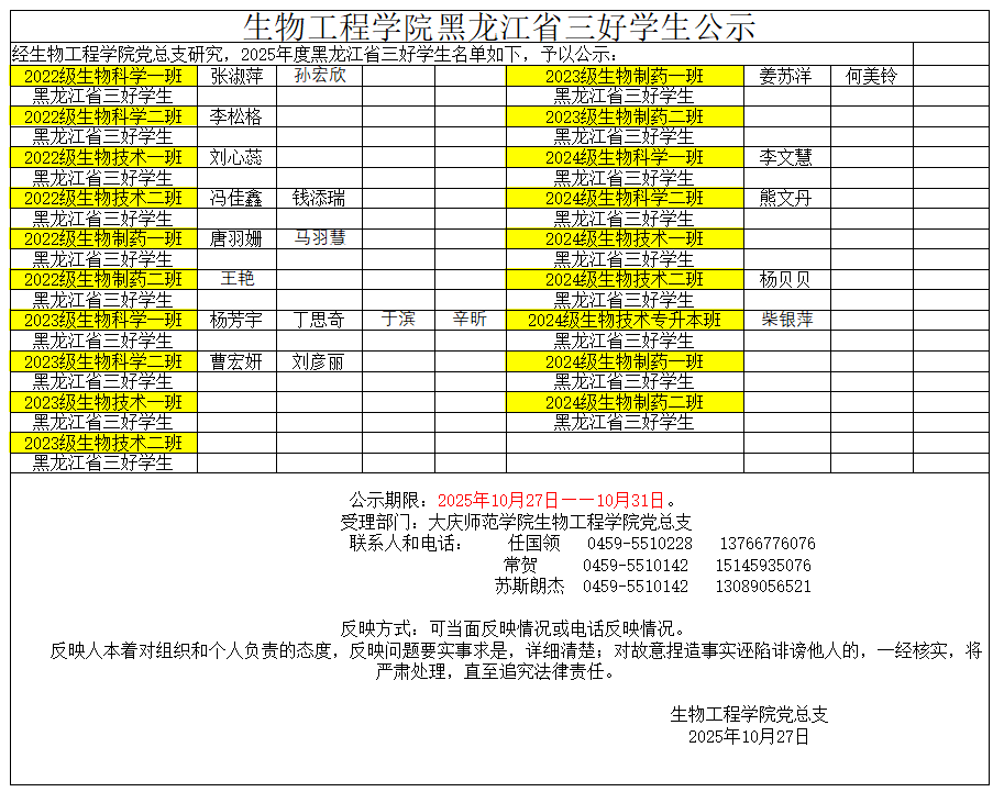 生物工程学院2025年黑龙江省普通高等学校“三好学生”公示