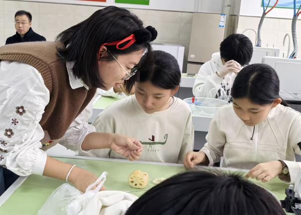 《从哪吒传说到未来科技--一株莲藕的跨学科狂想曲》课堂上,两位老师分别扮演神话人物“太乙真人”与“哪吒”,以轻松幽默的小品形式开场,迅速点燃了现场气氛。随后,课程围绕莲藕展开跨学科探索,从植物学角度解析莲藕的结构、生长特性及其“藕断丝连”的独特现象。通过丰富的图片、动画以及莲藕的切片和显微镜观察实验,同学们不仅直观感受到莲藕结构的奇妙,也对神话中“莲藕化身”的情节有了科学层面的理解。在回溯传统文化的同时,进一步延伸至前沿科技领域。主讲人介绍了武汉轻工业大学在“莲藕造骨”技术方面的研究成果,以通俗的语言阐释科研原理,并鼓励同学们关注科学细节、培养探索精神。现场气氛活跃,同学们在欢声笑语中感受到科学的魅力。