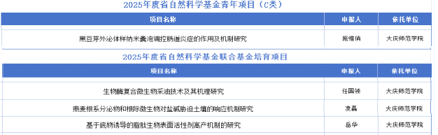 我院2025年引进博士庞惟俏老师主持的《黑豆芽外泌体样纳米囊泡活性成分对肠道炎症的调控作用及相关机制研究》获批省青年科学基金C类项目;任国领教授主持的《生物酶复合微生物采油技术及其机理研究》、凌磊副教授主持的《燕麦根系分泌物和根际微生物对土壤盐碱胁迫的响应机制研究》和岳华博士主持的《基于底物诱导的脂肽生物表面活性剂高产机制的研究》获省联合基金培育项目。